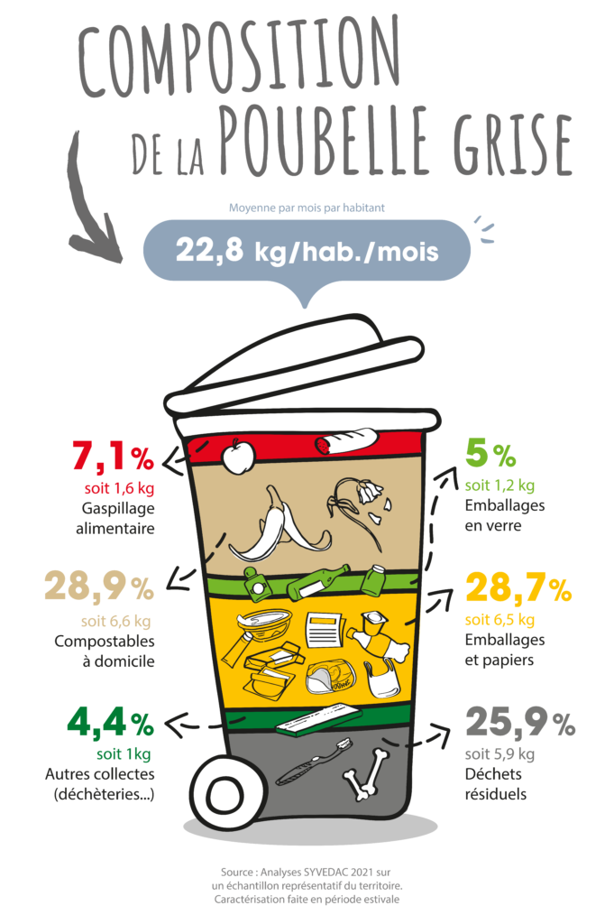 Nous produisons en moyenne en France 590 kg par an et par habitant de déchets (ordures ménagères et déchets de déchèterie, source SERD 2020), soit le poids de 4 000 Tour Eiffel…Cette quantité a doublé en 40 ans.